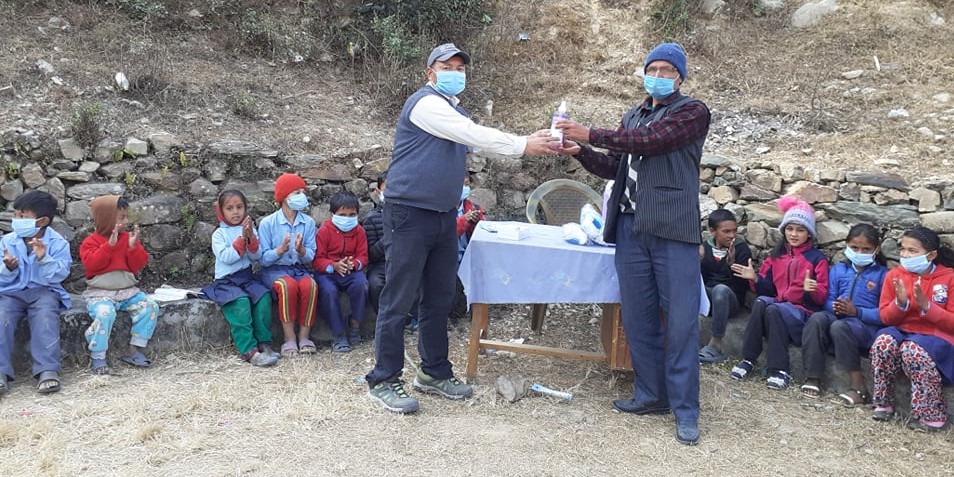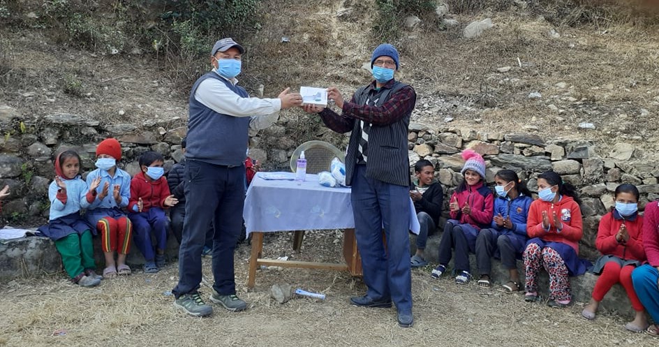Covid-19 Awareness Program plus Covid-19 preventive Materials distribution Program at Shree Balhit Primary School, Chaurideurali 5. A thermal gun and a sanitizer are provided to the school and Total:36 students received Masks.