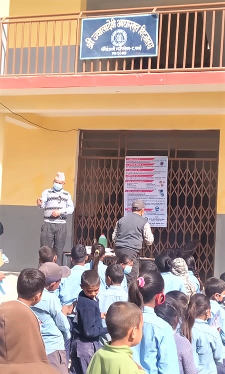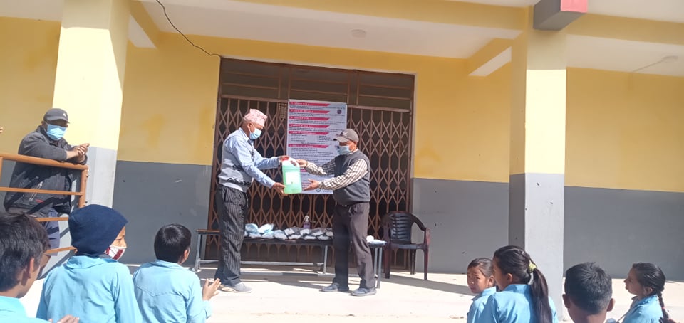 Covid-19 Awareness Program plus Covid-19 preventive Materials distribution Program at Jwaladevi Basic School, Chaurideurali 8. A thermal gun and a Sanitizer was provided to the school. Masks were distributed to total 81 students and 9 teachers.