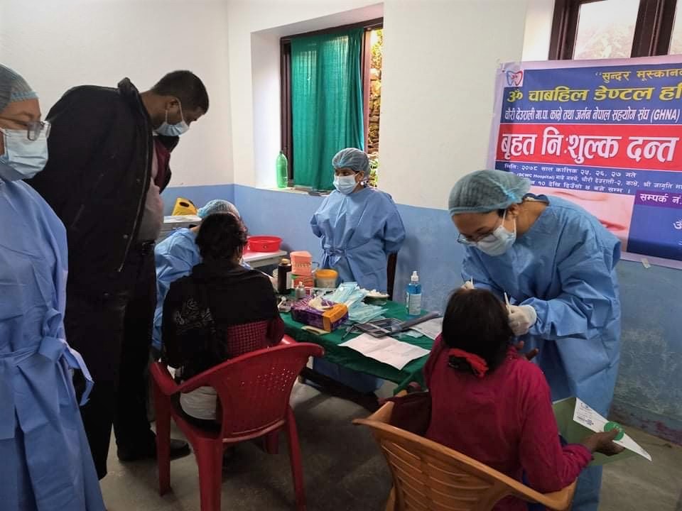 It was a mobile Health Camp which took place in DCWC Community Hospital on the 1st day and then in other 2 Venues. At the hospital we provided lodges and food for 22 people altogether (Medical teams and Government People).Financial Support from German Nepal Help Association (GNHA) and Technical Support from Om Chabhel Dental Hospital and Nepal Netra Jyoti Association