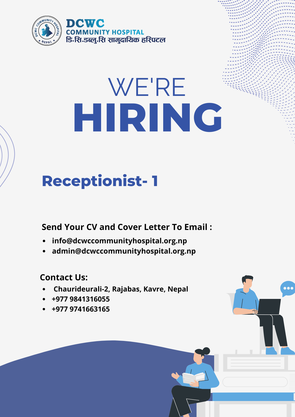DCWC Community Hospital lies in Nagre Gagarche, Chaurideurali - 2, Rural Municipality, Rajbash in Kavre District of Nepal. It is 15 beds Hospital and in operation since 2010. It has good number of medical staffs lead by Medical Doctor and well equipped with X-ray, Lab Facilities, Pharmacy, 24 hour Emergency, OPD and In Patient services. In addition 24/7 Ambulance Service. The extension and improvement plans are still in progress.