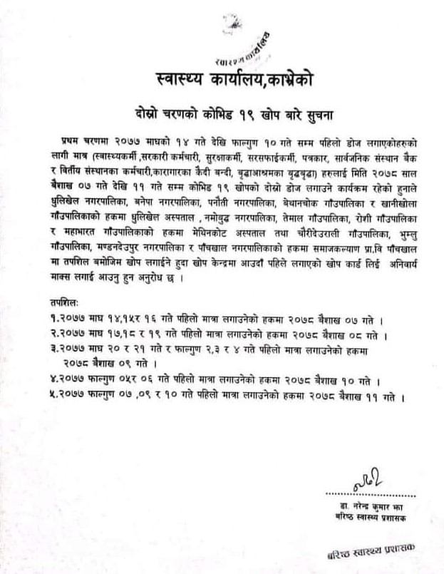 The Health Department, Kavre, Nepal  has announced the second dose  of covid-19 vaccine dates  and Venue for all Nepalese who got the 1st vaccine of the same one in the following dates. So, donot miss it.
