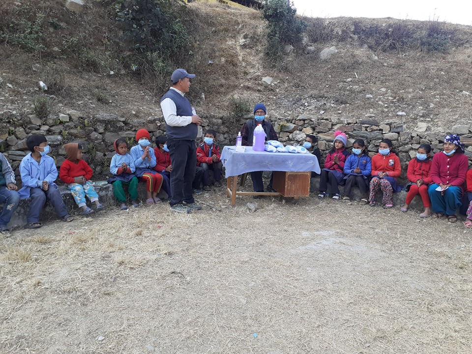 Covid-19 Awareness Program plus Covid-19 preventive Materials distribution Program at Shree Balhit Primary School, Chaurideurali 5. A thermal gun and a sanitizer are provided to the school and Total:36 students received Masks.