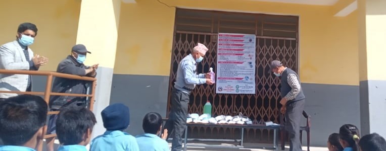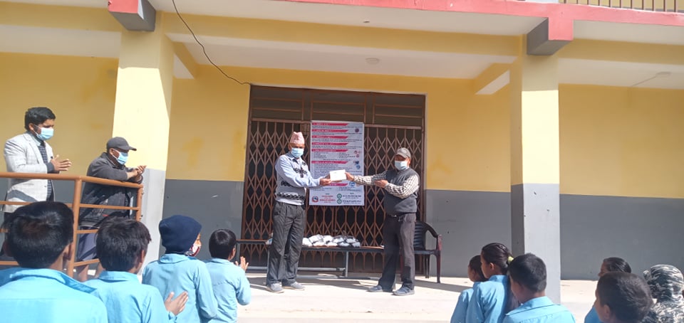Covid-19 Awareness Program plus Covid-19 preventive Materials distribution Program at Jwaladevi Basic School, Chaurideurali 8. A thermal gun and a Sanitizer was provided to the school. Masks were distributed to total 81 students and 9 teachers.